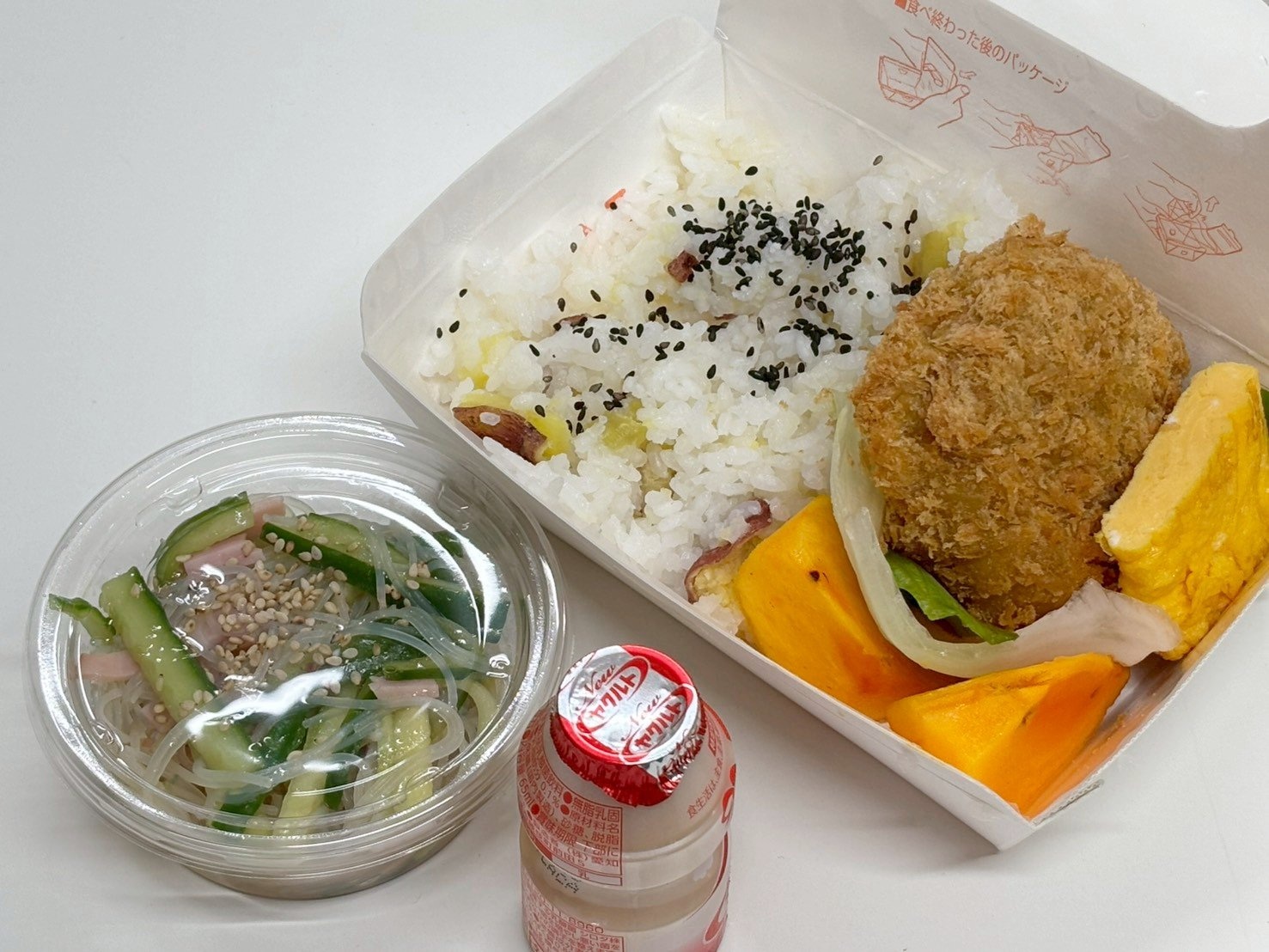 メンチカツとさつまいも、卵焼き、春雨サラダの定食60食、提供しました。デザートに神奈川東部ヤクルト販売さんからご寄付いただいているヤクルト、そして柿をつけました。